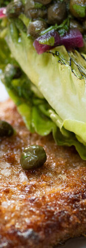 • Lämmitä ruskistettu voi ja lisää sipulikuutiot joukkoon anna sipulien pehmetä miedolla lämmöllä 5 minuuttia. Lisää kaprikset, hienonnettu persilja, sitruunan raastettu kuori ja mehu. Mausta suolalla ja mustapippurilla.